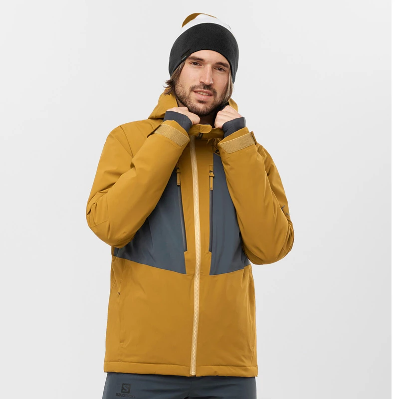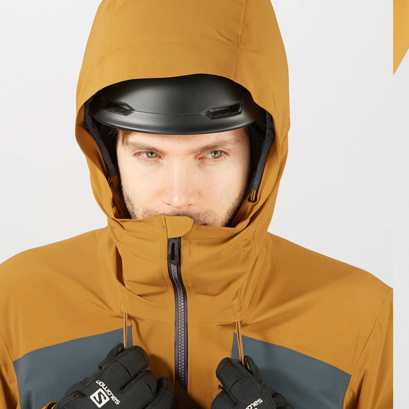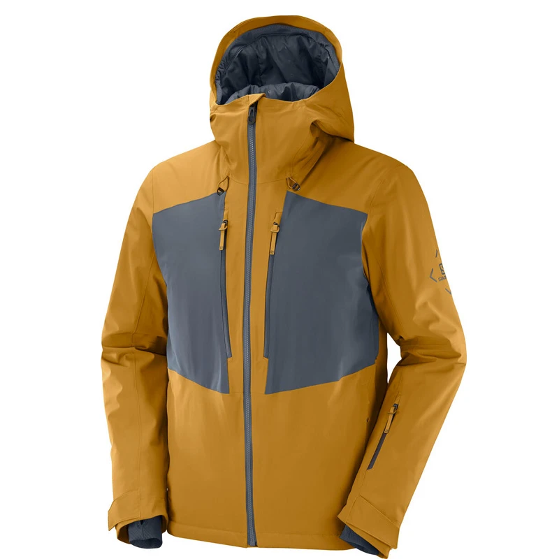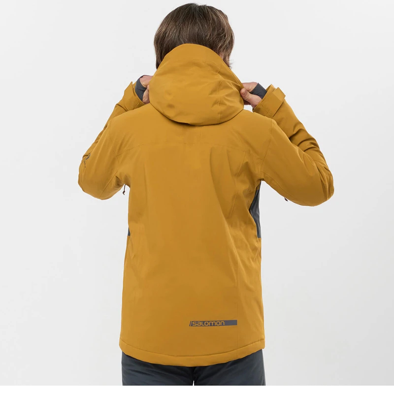 Salomon sporty skijakke til herrer i regular fit, med fast hætte og gennemgående YKK lynlås.